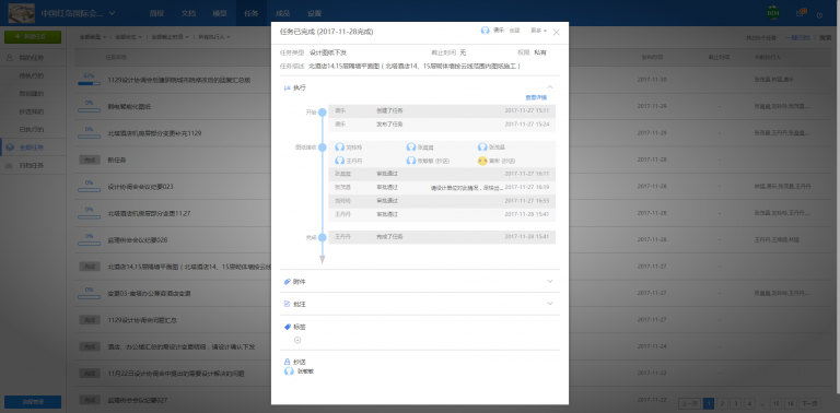 2、在任务模块中进行图纸下发、设计变更、会议纪要等,其中图纸变更分为两种类型:一种是现场问题后,发起任务流程进行协作,另一种是有甲方主动要求的更改,也会第一时间通过协筑的任务模块发起流程。