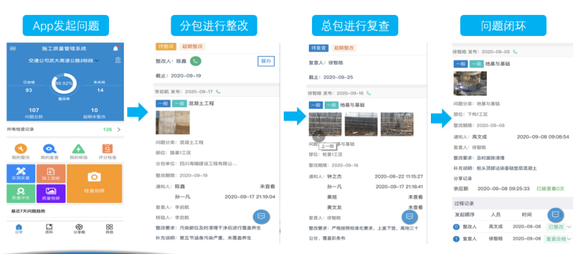 1) 质安问题通过云加端手段实现现场质安检查、整改、复查等流程扭转,实现了项目领导对项目质安问题的实时监管 。