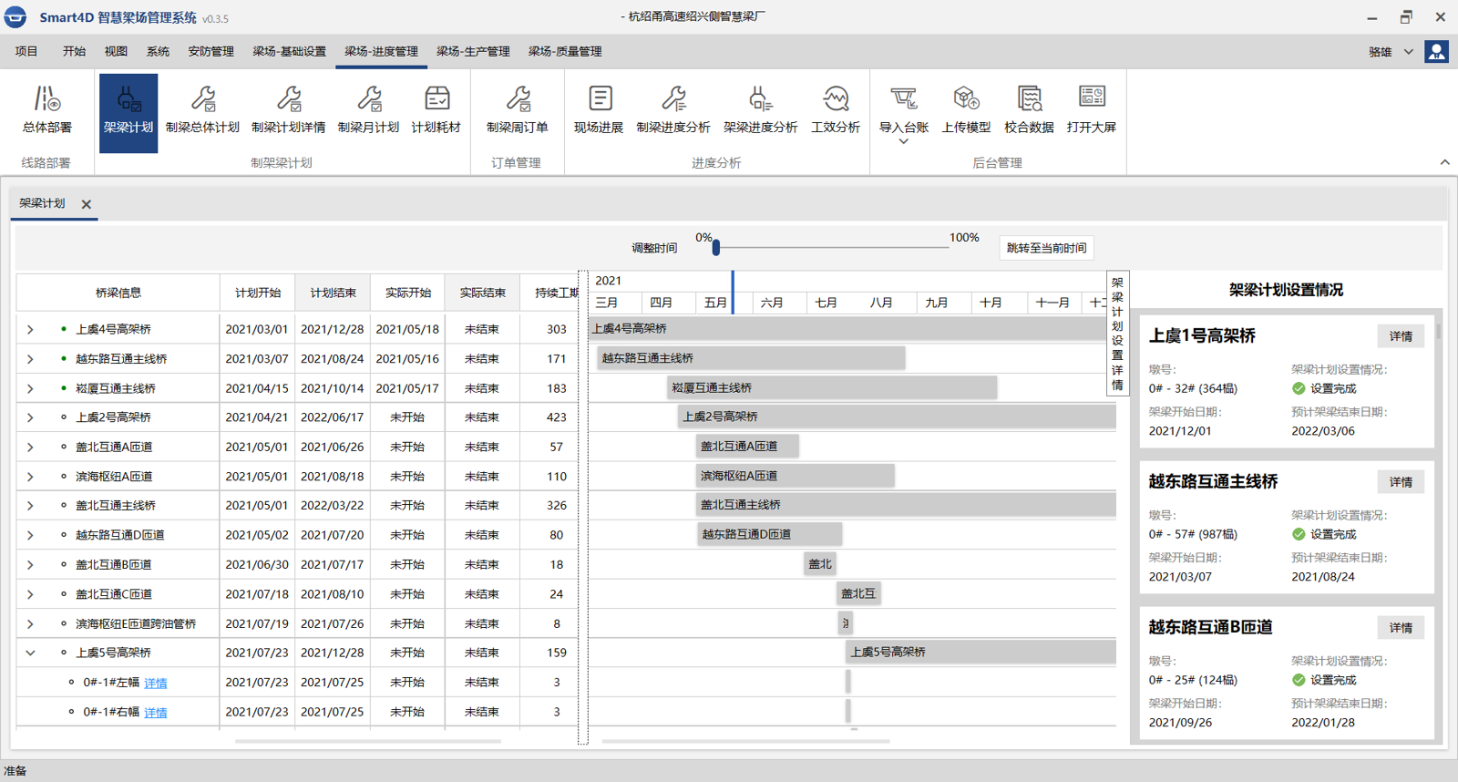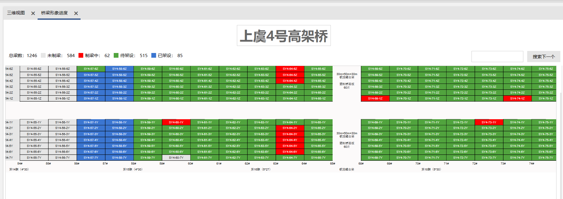通过提取制梁、存梁和架梁信息,以单位工程桥梁为维度,分别直观展示每一个单位工程桥梁的针对每一跨、每一榀梁的施工进展,电子形象进度图根据现场进度自动染色,不同颜色代表不同状态,各跨情况一目了然,提升效率。