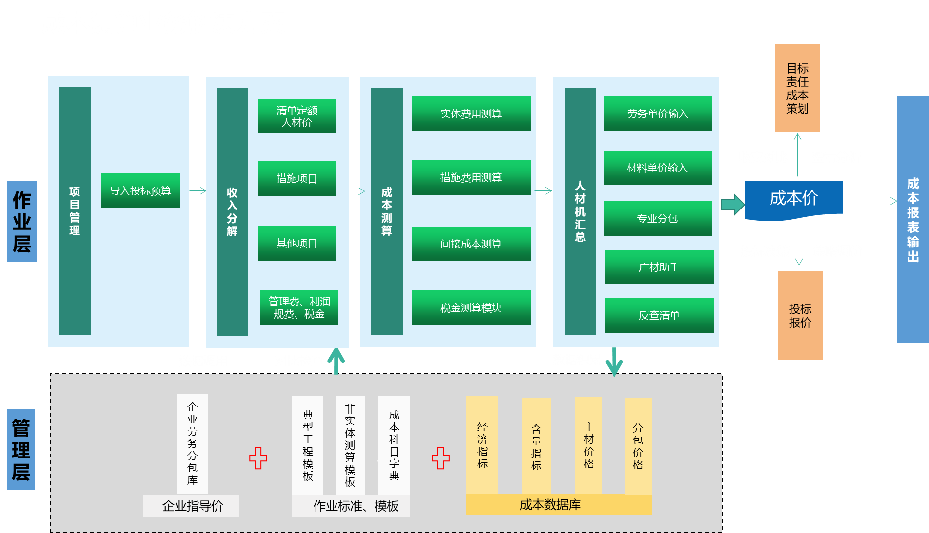 项目方案为解决施工成本测算及成本数据库的沉淀,首先基于总部层面建立统一的成本科目标准、成本测算模板库、企业定额及材料指导价格等标准计价依据,通过产品让项目一线成本人员直接调用统一的标准及模板作业,快速进行标前成本或目标成本测算的同时能够一键提交审核,清晰数据来源方便调整;各项目的成本价格又可以分别入库整理,多维度分析得出成本指标价格、主材价格及分包清单价格。