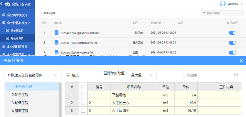 企业总部成本部管理分包指导价格库,对有效数据进行加工、自维护,实现企业数据统一化、标准化、动态化管理;项目通过应用端可直接调用企业分包指导价,实现企业数据沉淀以及快速复用。分包数据动态调整的同时一键动态刷新数据,实现数据无痕更新复用。