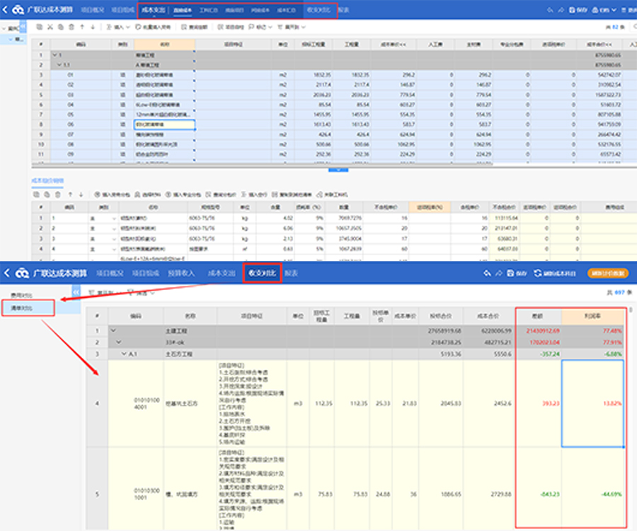 3、项目按照成本科目、逐条清单对比预算收入和支出成本进行盈亏分析。