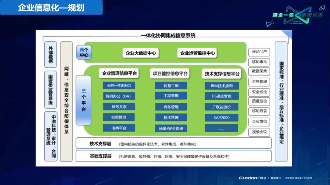 三个平台,分别是企业管理信息平台、项目管控信息平台、技术支撑信息平台。其他还有防控体系、技术支撑等相关设施保障。
