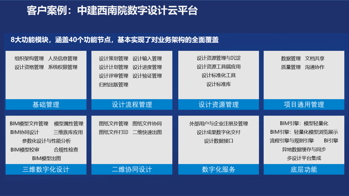 中建西南院数字设计云平台建设内容包含项目管理、设计协同、流程管理、轻量化应用、资源管理、系统集成等8大功能模块,涵盖40个功能节点,基本实现了对业务架构的全面覆盖。