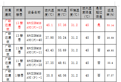 模拟分析完成后,自动统计所有室外机进排风温度情况进行展示,同时给出结论:共有1台进风温度超过限值,进风温度超限后热量不能很好扩散,会影响机组的制冷效果,建议通过调整室外机布置间距、增加导风管等方式来增强散热,确保机组正常运行。