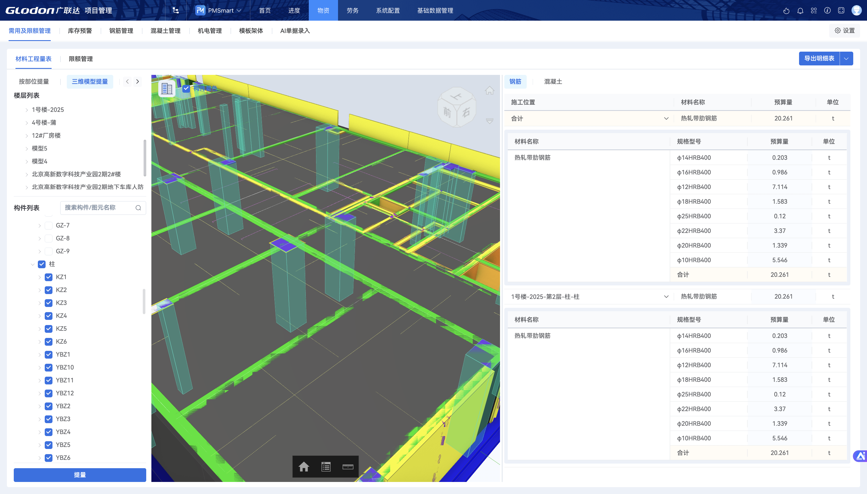 【需用策划场景】PMSmart通过对GTJ模型的解析,可实现模型上按楼栋、楼层、构件类型、单根构件(图元)多维度级别的材料需用量智能提取,较以往的提量方式更加清晰直观