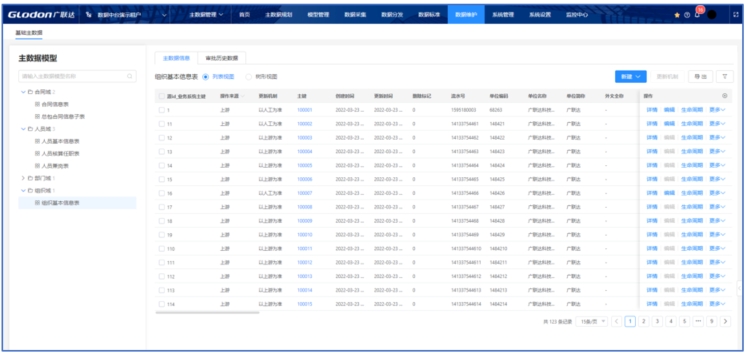 提供全场景的数据运营场景,通过对数据的查看、操作日志、数据版本、导出数据、手动分发数据等,使用户能够快速定位到目标主数据,实现主数据的可查、可控、可管