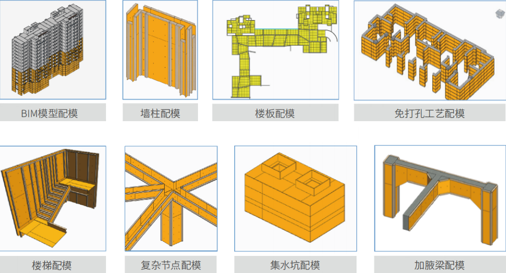 通过读取海量项目的模板方案以及数十个老木工师傅的经验数据,配模时,结合项目施工方案和BIM模型,通过参数设置和算法,即可实现墙、柱、梁、板一键智能配模及复杂工况、异形结构的快速排布配模。
