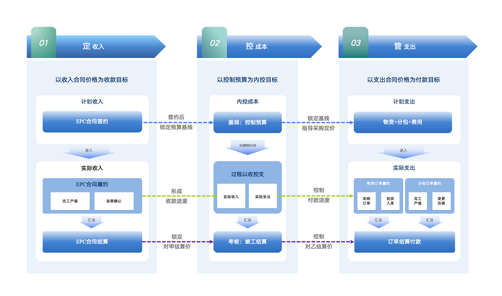 以 “定收入、控成本、管支出” 为目标,含三维度管理。定收入以 EPC 合同价为目标,签约到结算汇总产值与发票;控成本以预算为基线考核收支;管支出以合同价付款,覆盖物资等,全流程管控。