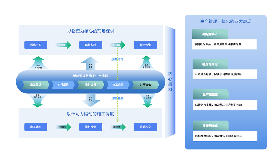 以“生产流程”为核心,依托物资保障与计划调度。物资端从申购到收料、余料管理,按需保供;计划端依据施工计划,含物料检查、消缺移交管控。通过精细化管理,助力项目成功。