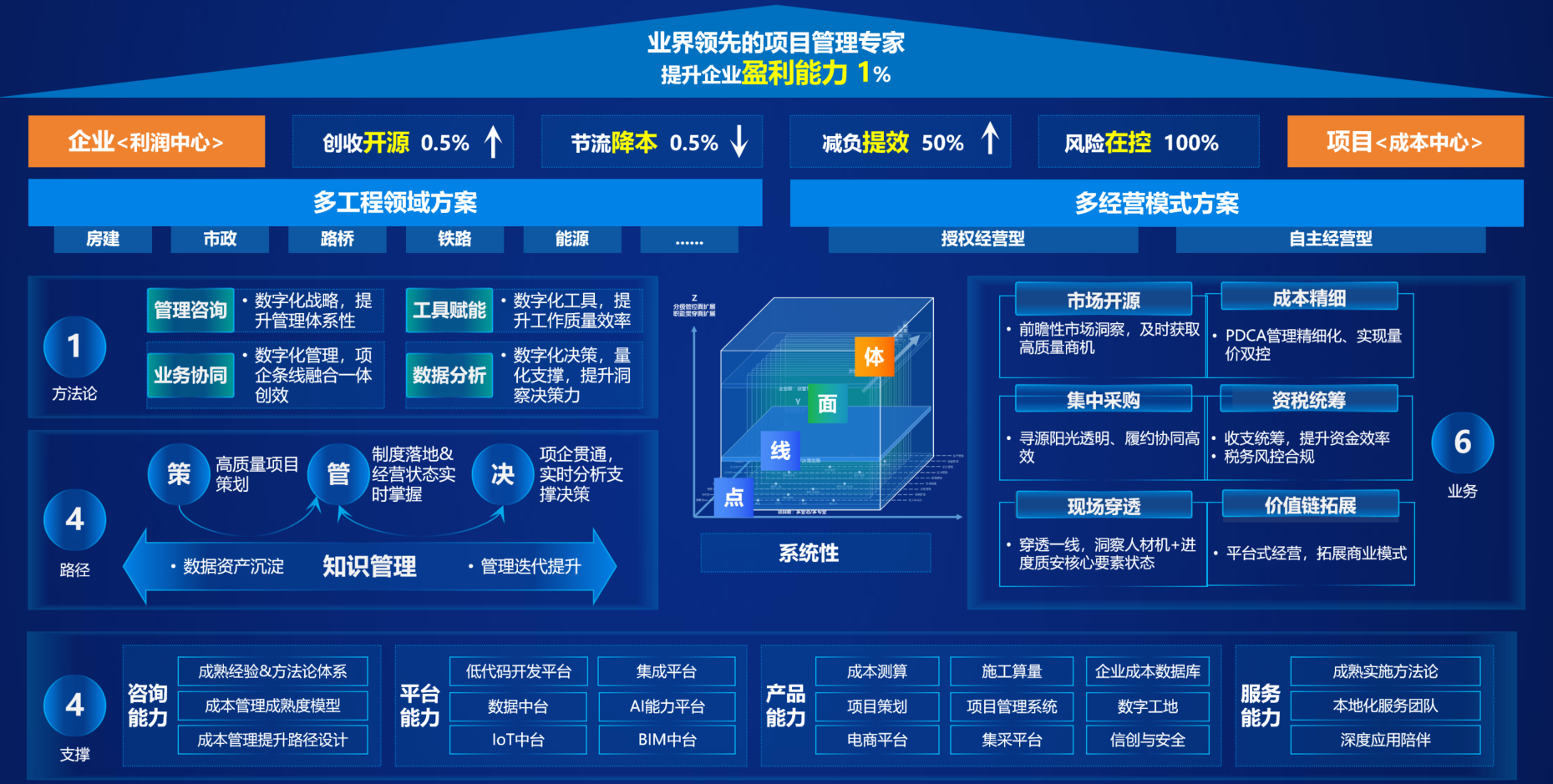 管得住——通过数字化系统应用,赋能管理人员承上启下,实时掌握一线业务动态,确保项目管理的标准化落地,实现项目精细化管理、企业集约化经营。