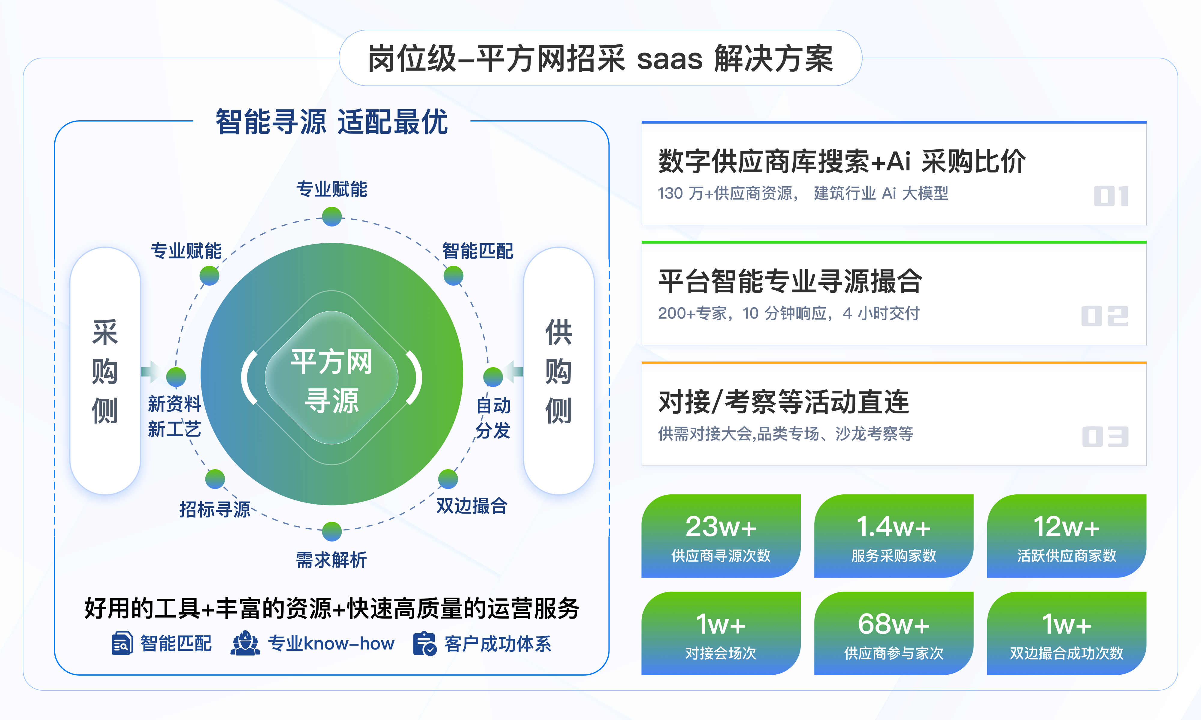 从信息服务到采供撮合业务的重要跨越。深入洞察建材市场,为建材企业精心打造涵盖市场洞察、营销推广、商机撮合等环节的全链路营销解决方案。