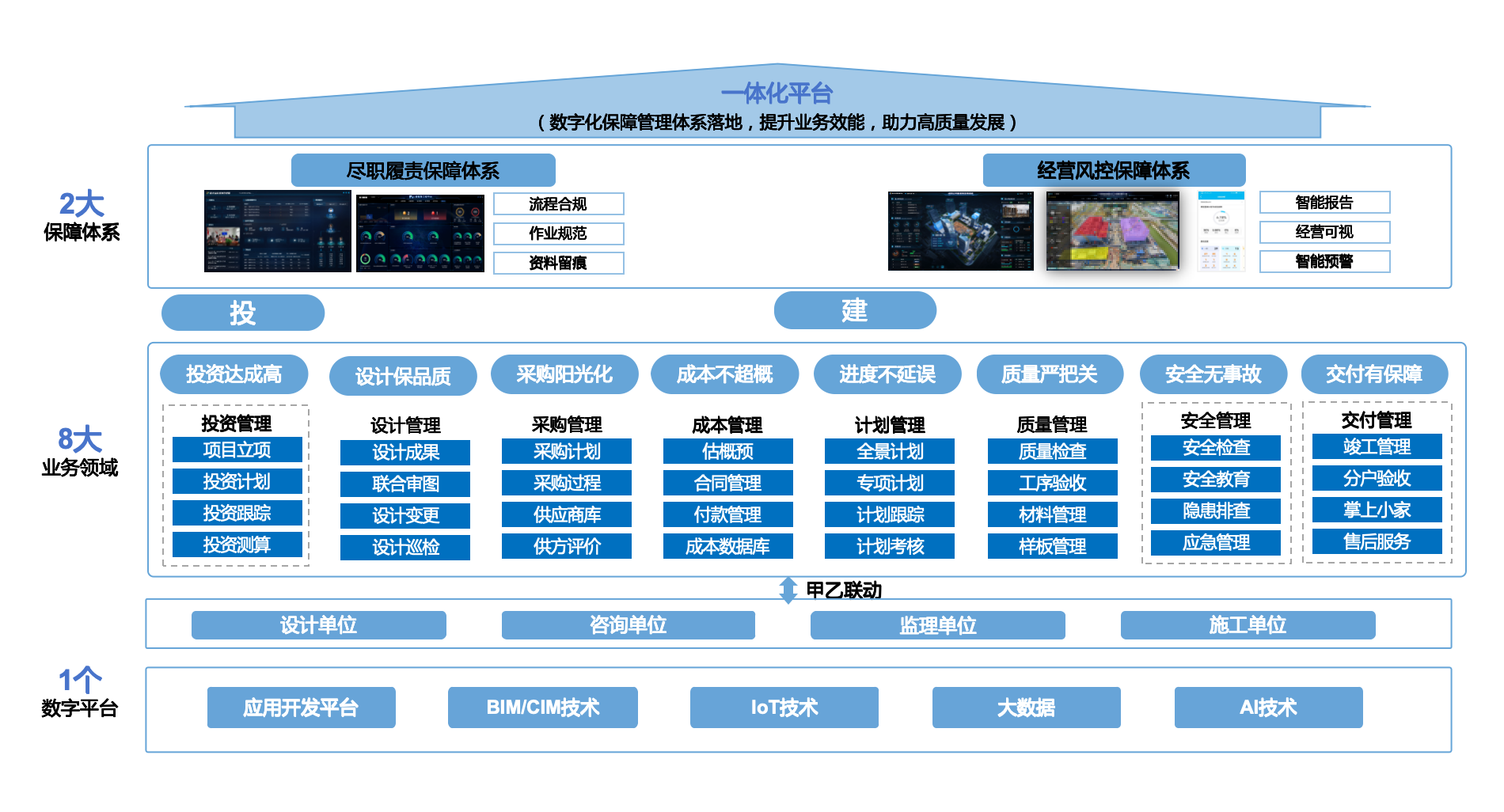 ·作业层:在传统数字化技术的基础上,加入物联网、AI、BIM等先进技术,实现甲乙联动,将传统的数字化业务进行创新,实现业务管理优化与重塑。