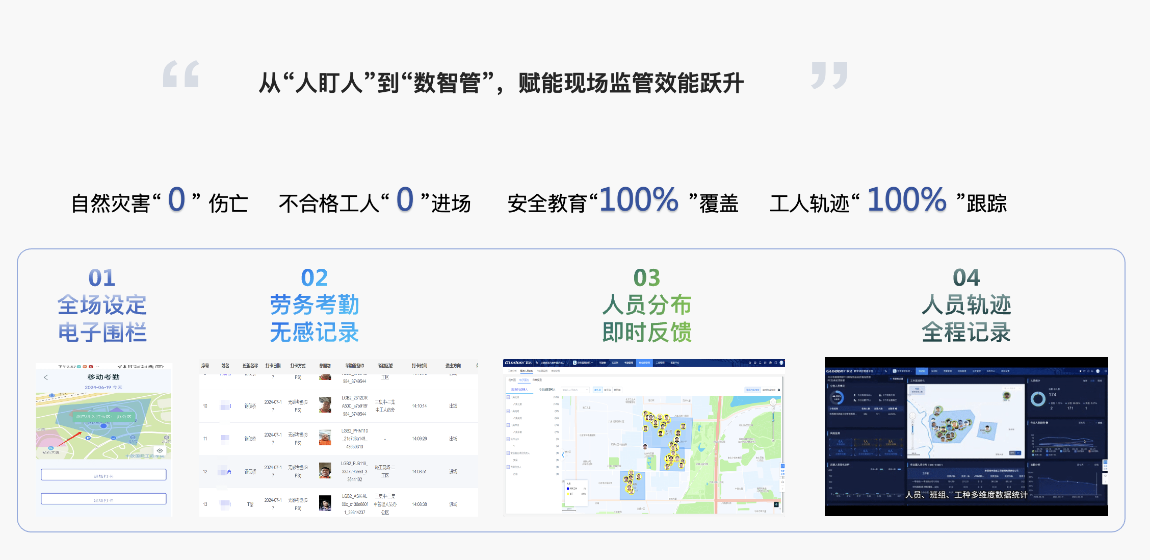非封闭区域大批量上工实时定位;现场工效、劳务成本、项目进度可视化;防控新能源电站建设26种用工风险